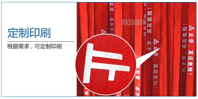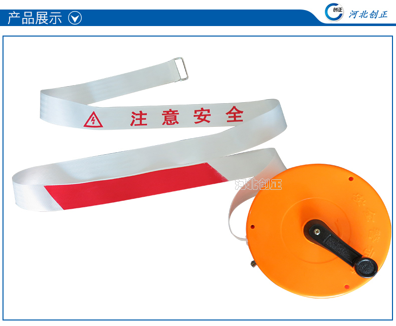 警示帶盒是ABS材料制成;帶是錦綸材質,上面印有“閃電符號,止步,高壓危險”等字樣。