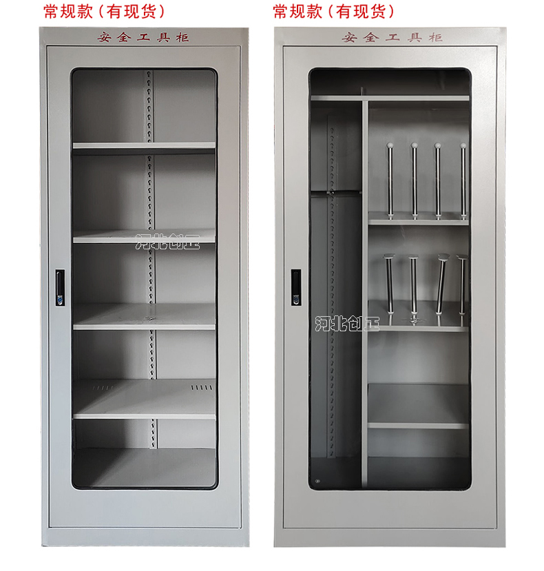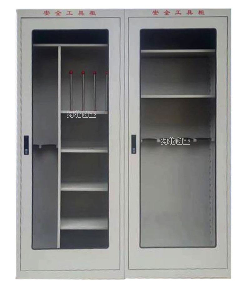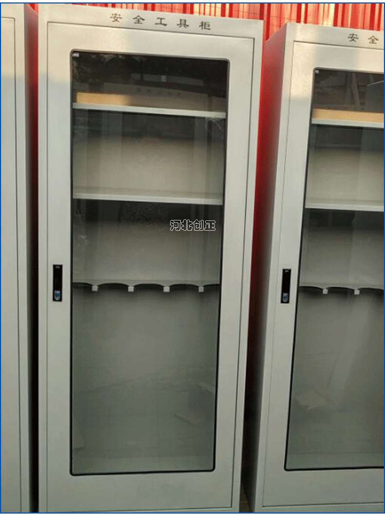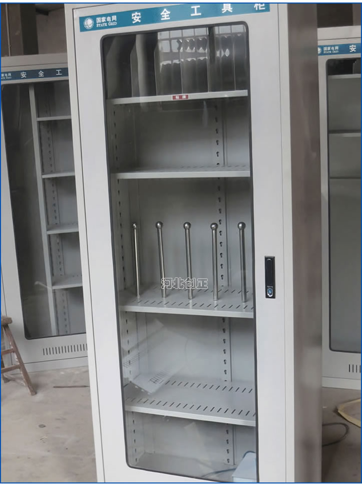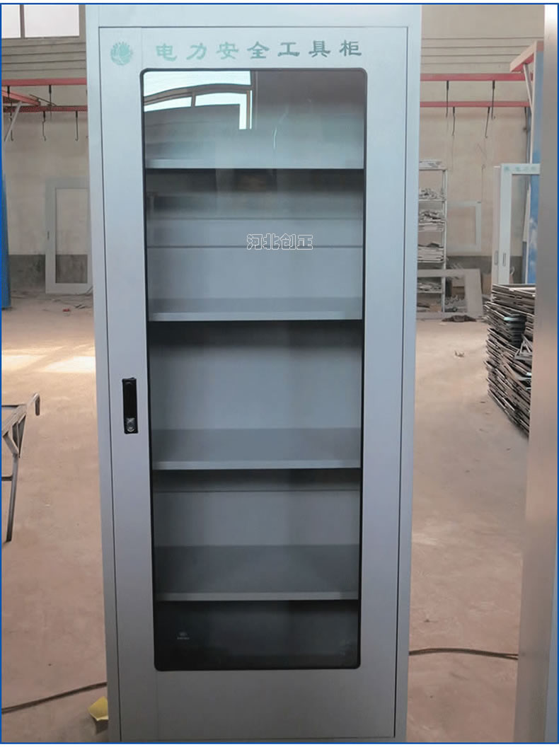 1、柜體是冷軋鋼板卷壓成型,厚度有1.0mm1.2mm1.5mm供選擇。柜體表面采用靜電防腐噴塑工藝,顏色為駝灰色,柜門裝有通體透明鋼化玻璃,透過玻璃可以看到分類有序的工器具。