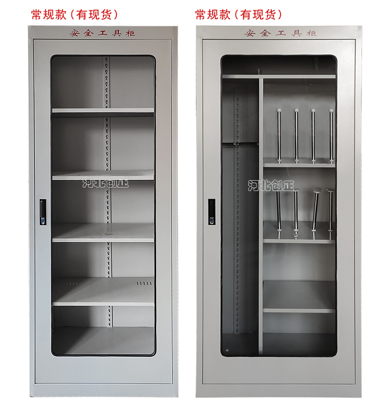 1、柜體是冷軋鋼板卷壓成型,厚度有1.0mm1.2mm,1.5mm供選擇。柜體表面采用靜電防腐噴塑工藝,顏色為駝灰色,柜門裝有通體透明鋼化玻璃,透過玻璃可以看到分類有序的工器具。