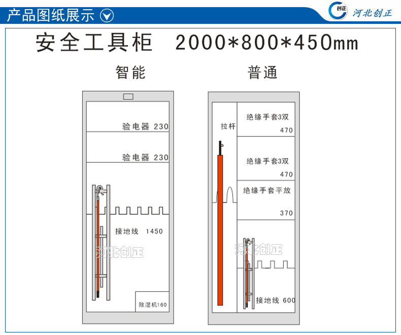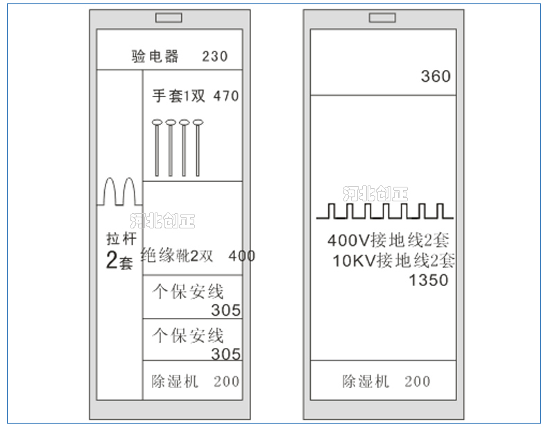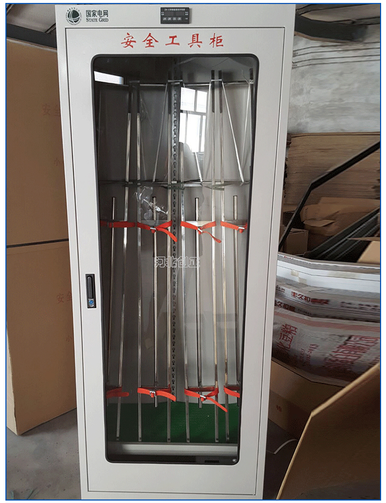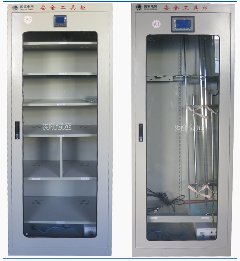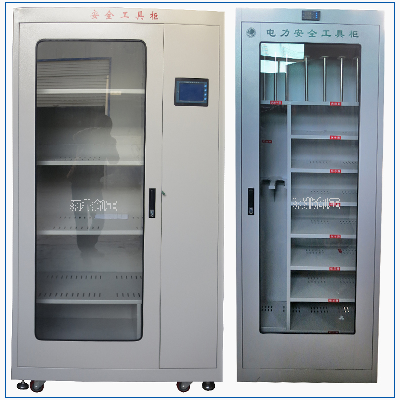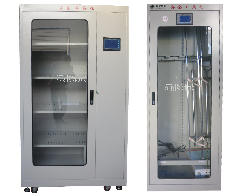 2、智能型安全工具柜裝有溫濕度顯示表和控制操作面板,顯示溫濕度和設備運行狀態。柜底可選擇安裝萬向輪和定位螺桿;柜頂可選擇安裝吊杯,方便運輸。應用于不同溫濕度地區的不同電壓等級的變電站、集控站、線路工區以及電力公司等單位。