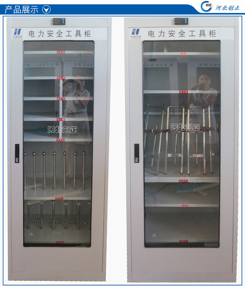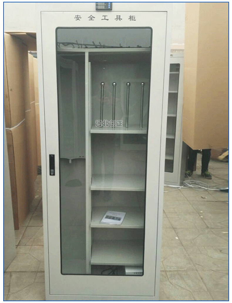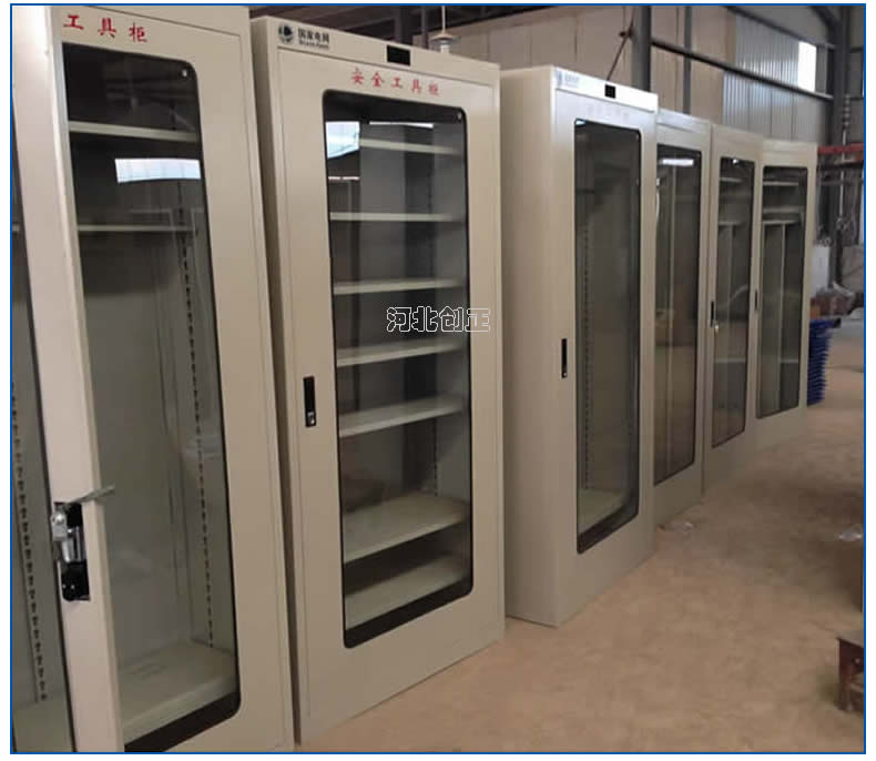 1、柜體是冷軋鋼板卷壓成型,厚度有1.0mm1.2mm1.5mm供選擇。柜體表面采用靜電防腐噴塑工藝,顏色為駝灰色,柜門裝有通體透明鋼化玻璃,透過玻璃可以看到分類有序的工器具。